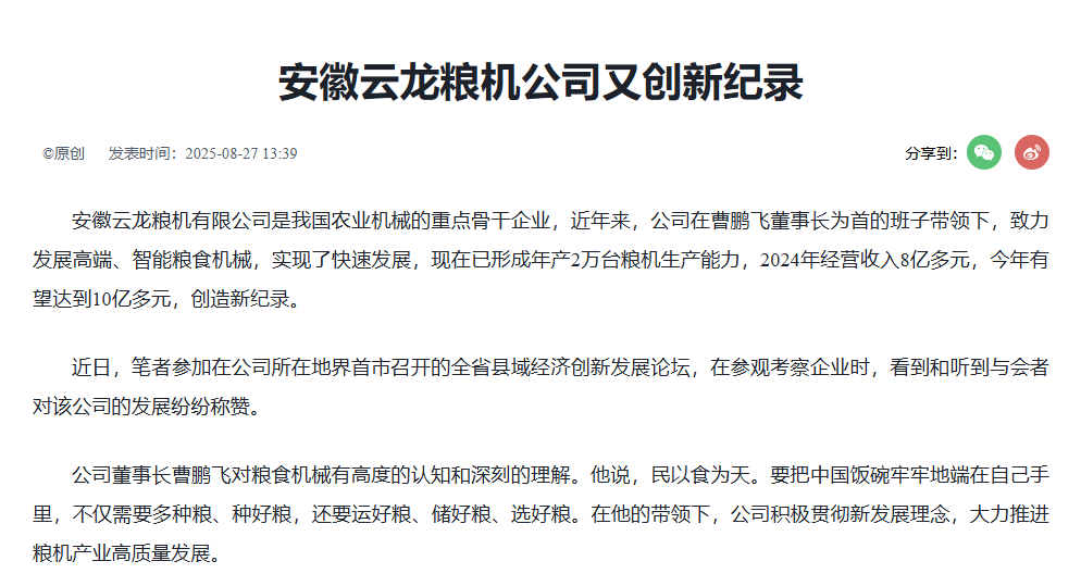 中國工業(yè)新聞網(wǎng):安徽云龍糧機公司又創(chuàng)新紀錄